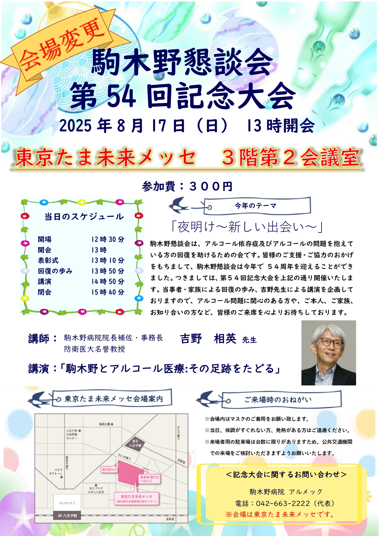 【会場変更のお知らせ】駒木野懇談会 第54回記念大会 アルコール 2025.07.22 日時:2025年8月17日(日)場所: 駒木野病院 A棟グリーンホール → 開催場所:東京たま未来メッセ 会議室棟3階 第2会議室住所:〒192-0046 東京都八王子市明神町3丁目19-2 (東京たま未来メッセ)◆駐車場は数に限りがございますので、当日ご来場の際は公共交通機関をご利用ください。一覧へ戻る