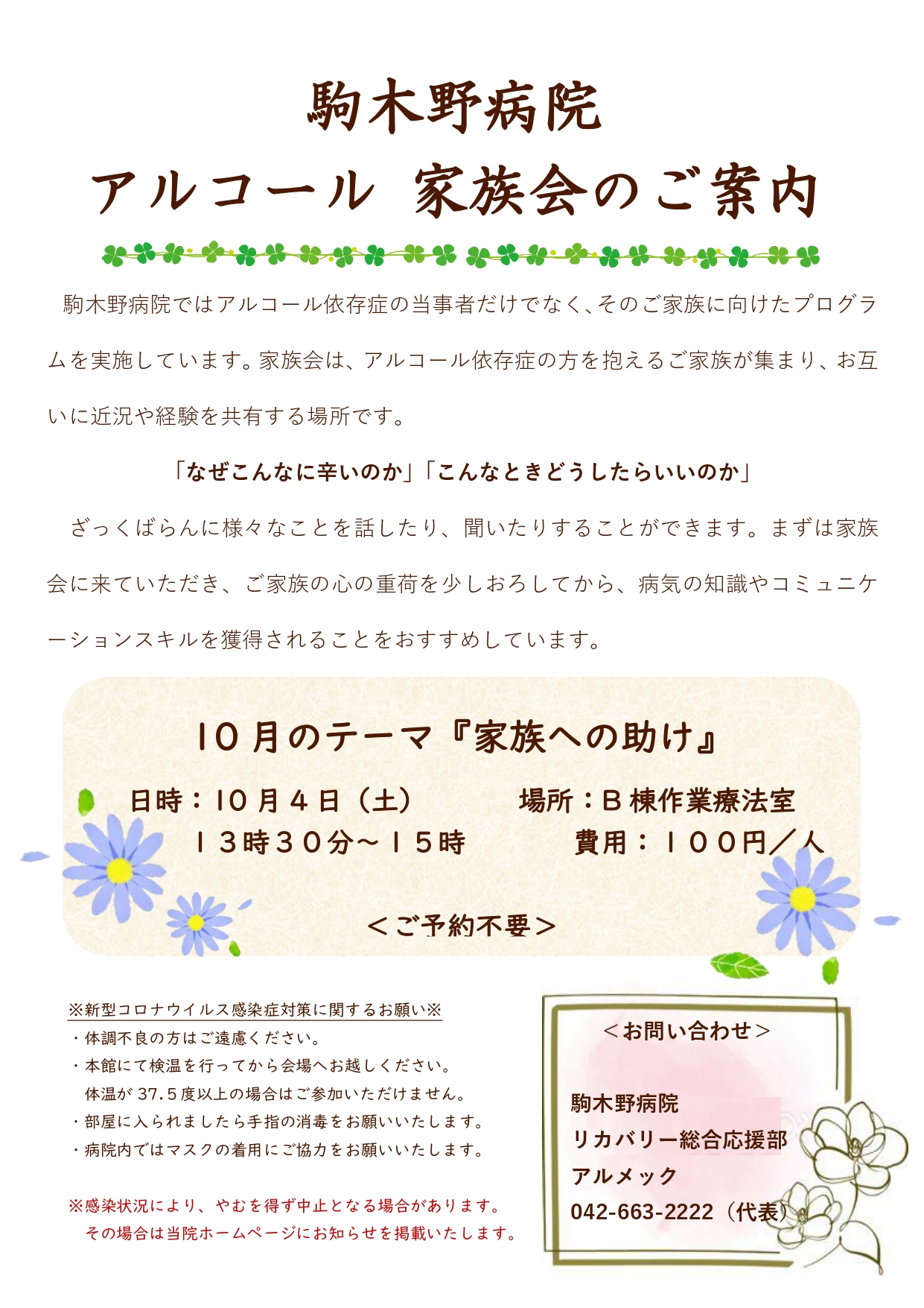 駒木野病院ではアルコール依存症の当事者だけでなく、そのご家族に向けたプログラムを実施しています。家族会は、アルコール依存症の方を抱えるご家族が集まり、お互いに近況や経験を共有する場所です。