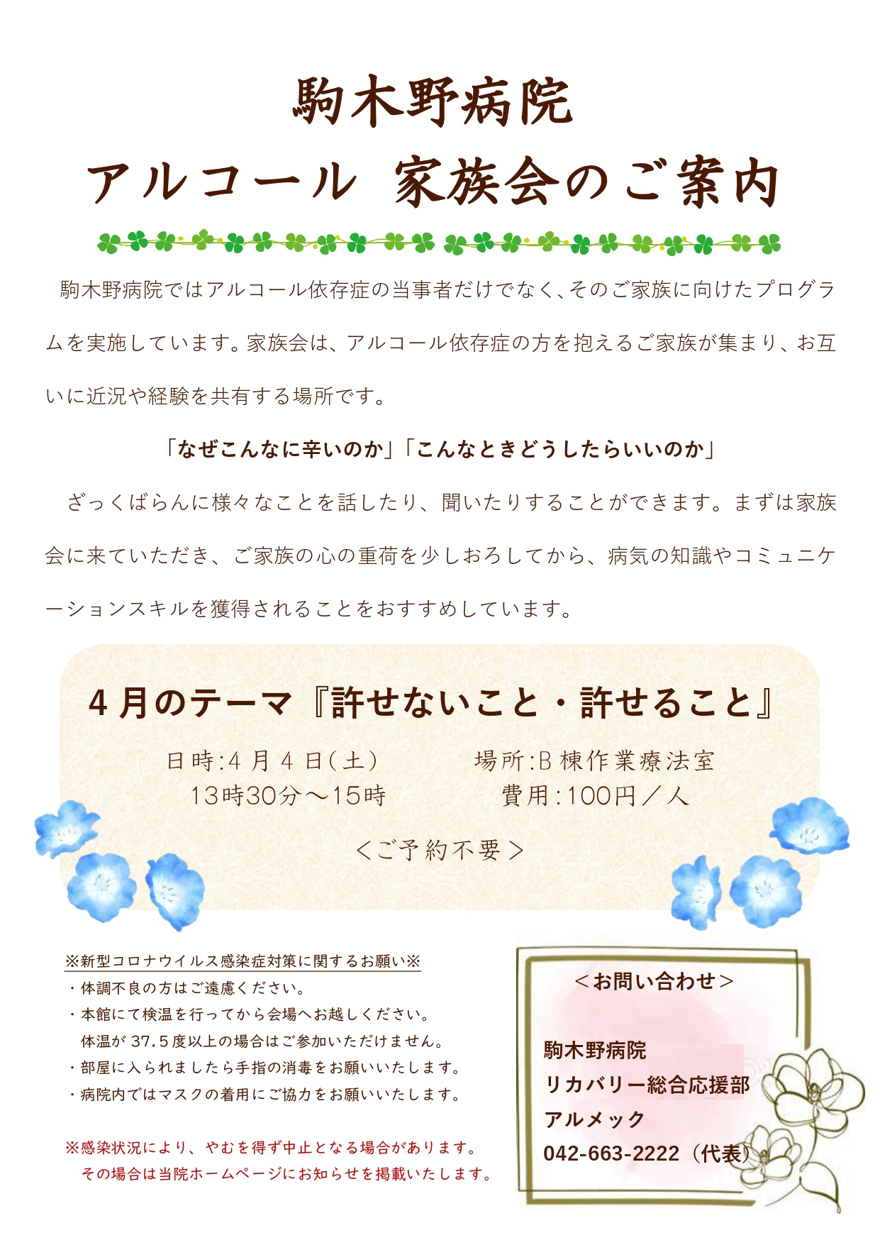 駒木野病院ではアルコール依存症の当事者だけでなく、そのご家族に向けたプログラムを実施しています。家族会は、アルコール依存症の方を抱えるご家族が集まり、お互いに近況や経験を共有する場所です。
