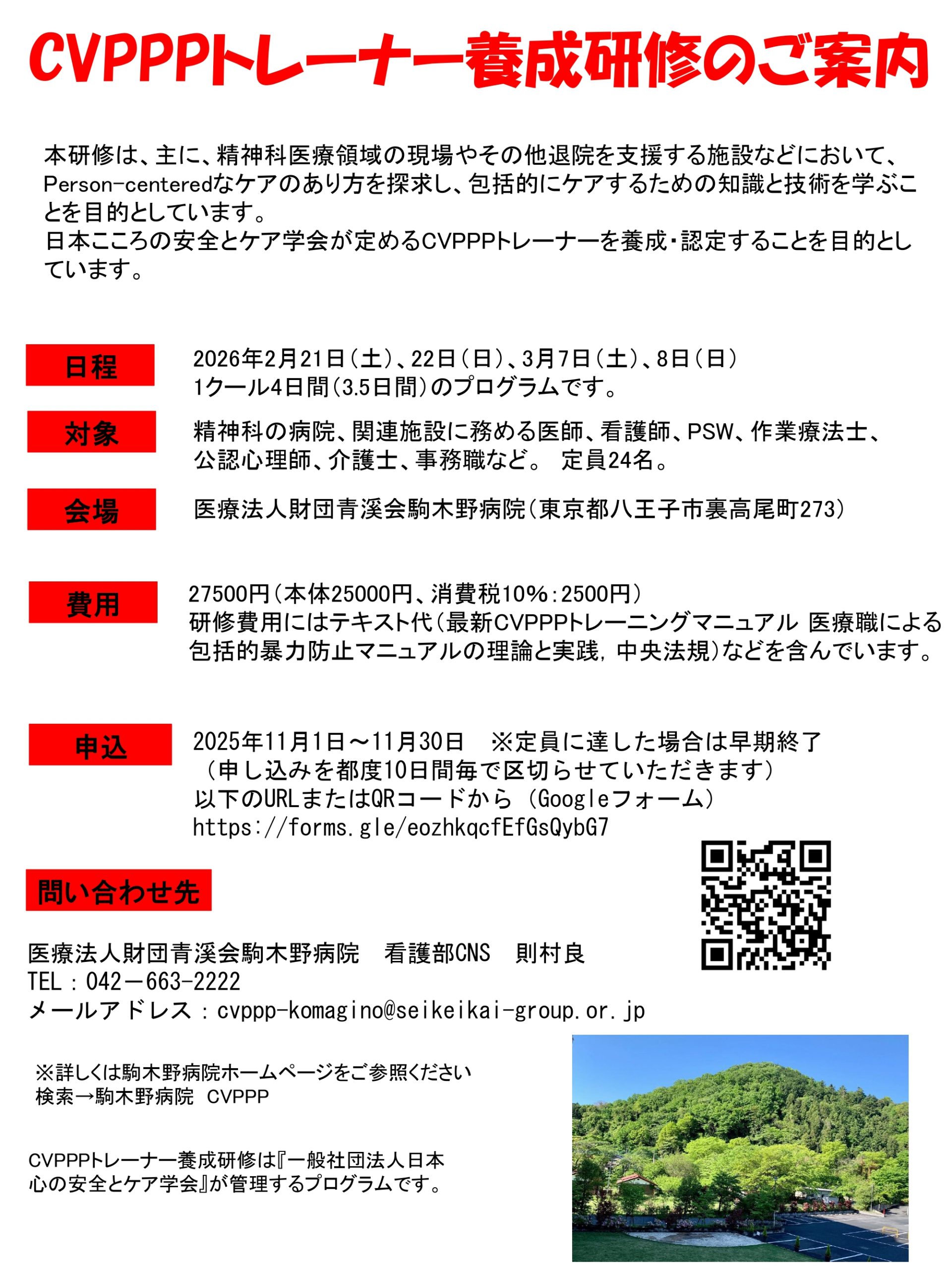 2025年度、駒木野病院では以下の日程で精神科医療、その関連領域に携わる方たちを対象にCVPPPトレーナー養成研修を開催します。
