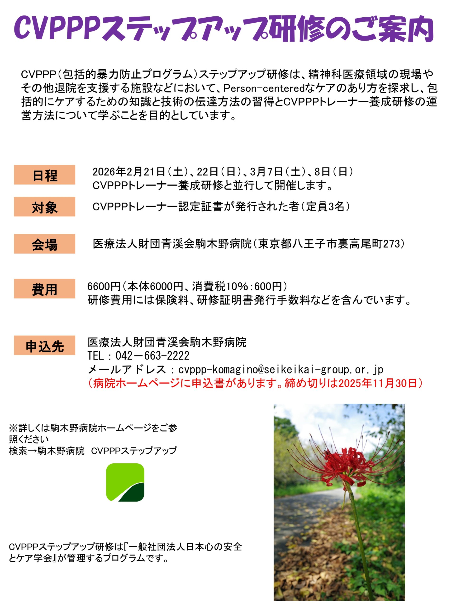 2025年度、駒木野病院では以下の日程でCVPPPトレーナーを対象にCVPPPステップアップ研修を開催します。