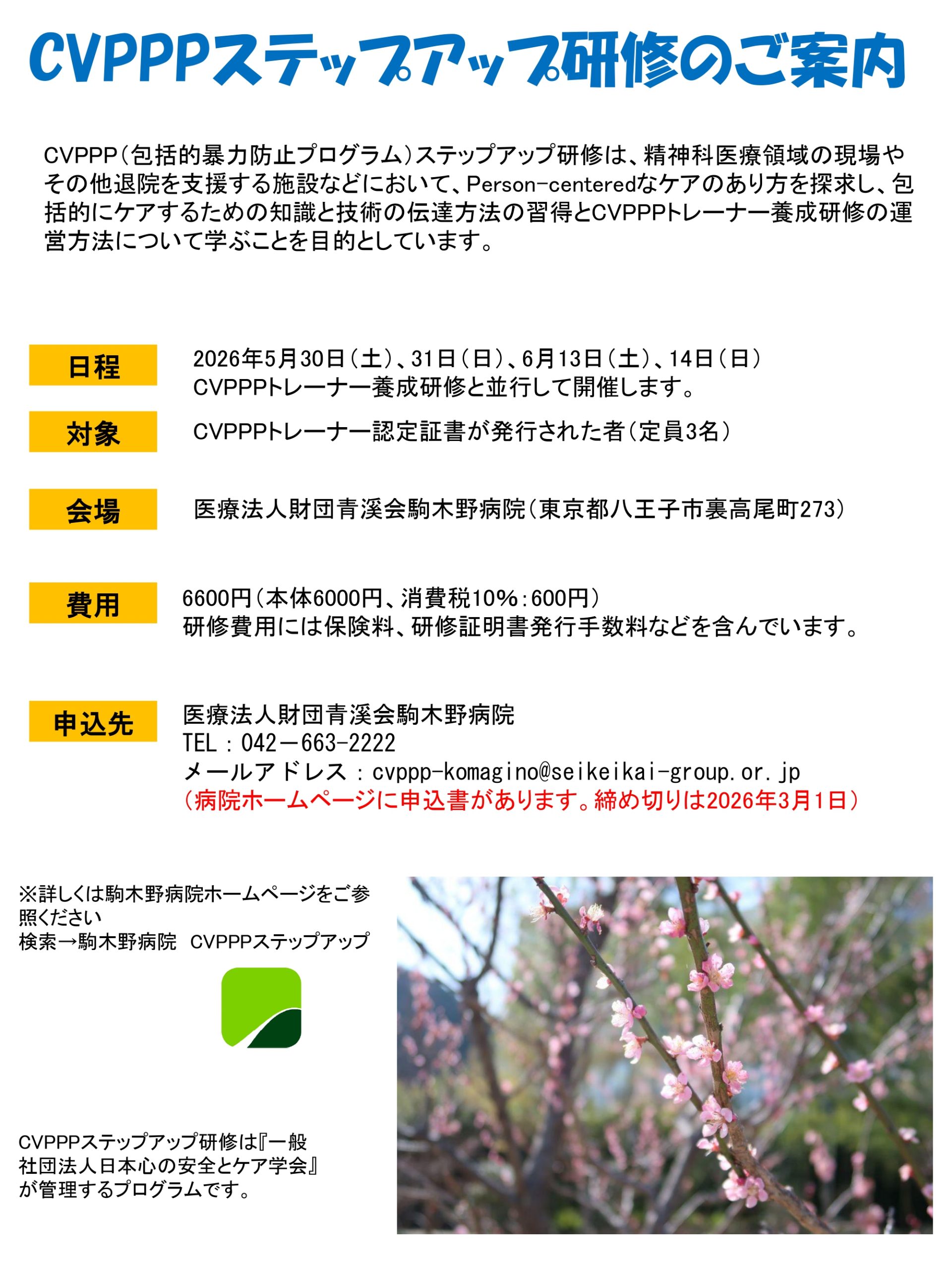 2026年度、駒木野病院では以下の日程でCVPPPトレーナーを対象にCVPPPステップアップ研修を開催します。