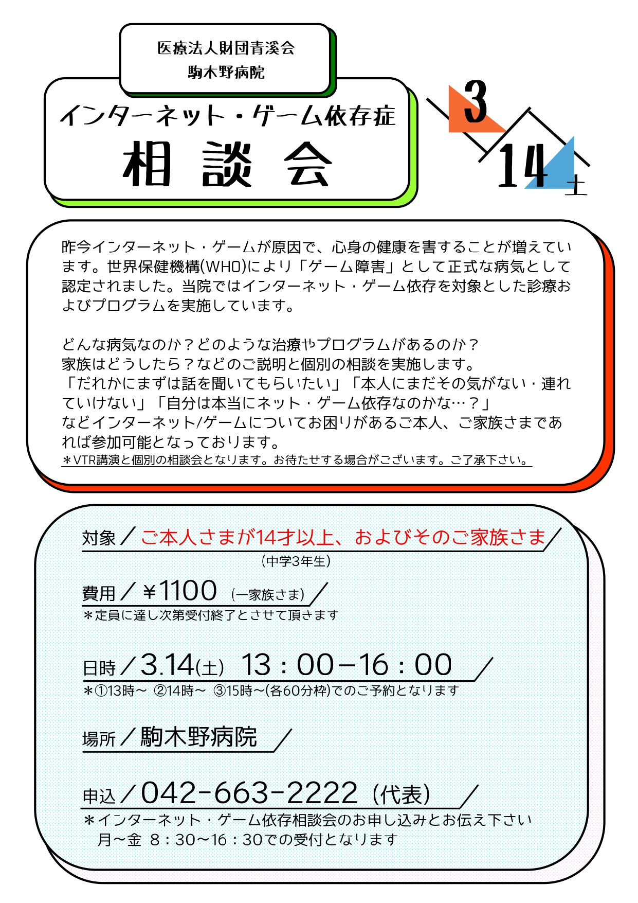 3月「インターネット・ゲーム依存」の相談会のお知らせ