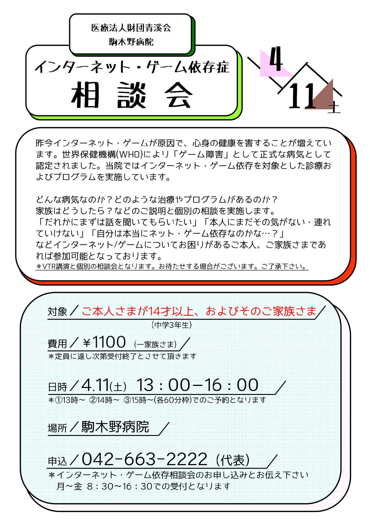 | お申し込み先 | 042-663-2222 月~金 8:30~16:30での受付となります ※インターネット・ゲーム依存相談会のお申込みとお伝えください |