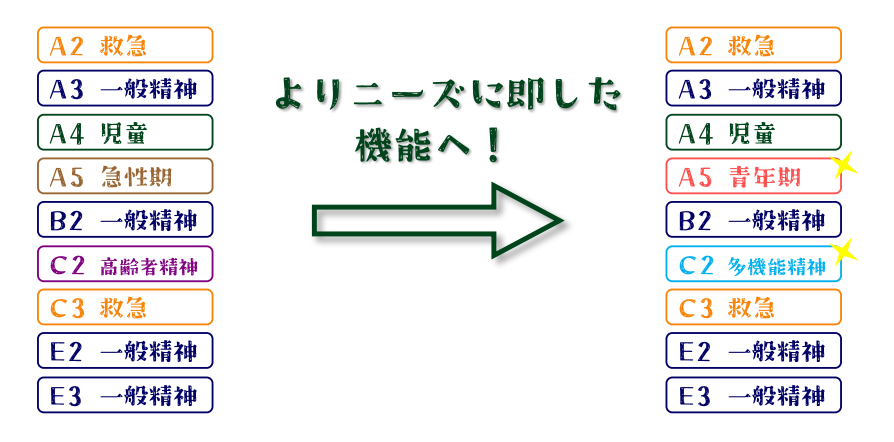 ①C2病棟(60床)を高いアメニティを備えた個室11床、強化個室10床を有する多機能病棟(47床)に改修し、精神科救急病棟に長期にわたって入院されている精神症状の顕著な患者様や退院後やむなく早期に再入院される患者様を受け入れる。