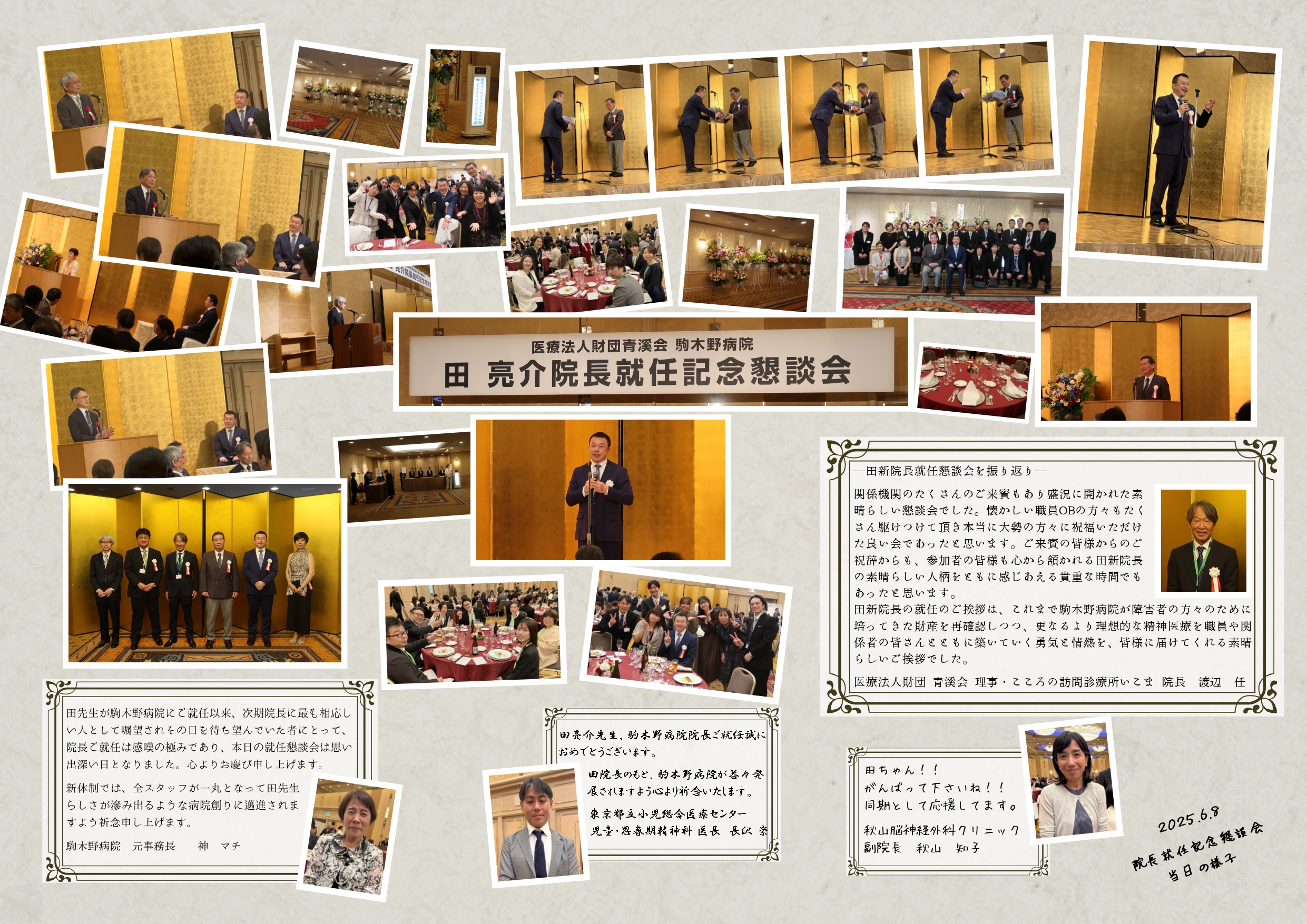 ご来賓の祝辞の中にもありましたが、就任式典でもパーティーでもなく「懇談会」となっている所は、私も最初に耳にしたときから気になっていました。会の中ほどでは、駒木野病院に縁深い沢山の方々が和気あいあいと語り合う光景がそこかしこで見られ、名前通り素晴らしい会でした。当日の空気が一部でも伝われば幸いです。